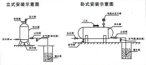 4.水泵一般选用潜水泵,可实现深度取水。特别注意如果下水深度超过30米一定要配备排气阀,以免抽水时产生的负压对罐体产生影响。